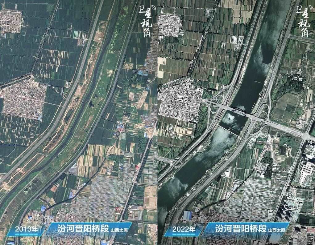 ↑2022年與2013年相比,通過綜合治理和生態(tài)景觀建設(shè),汾河太原城區(qū)晉陽(yáng)橋段水量更豐、風(fēng)光更美。