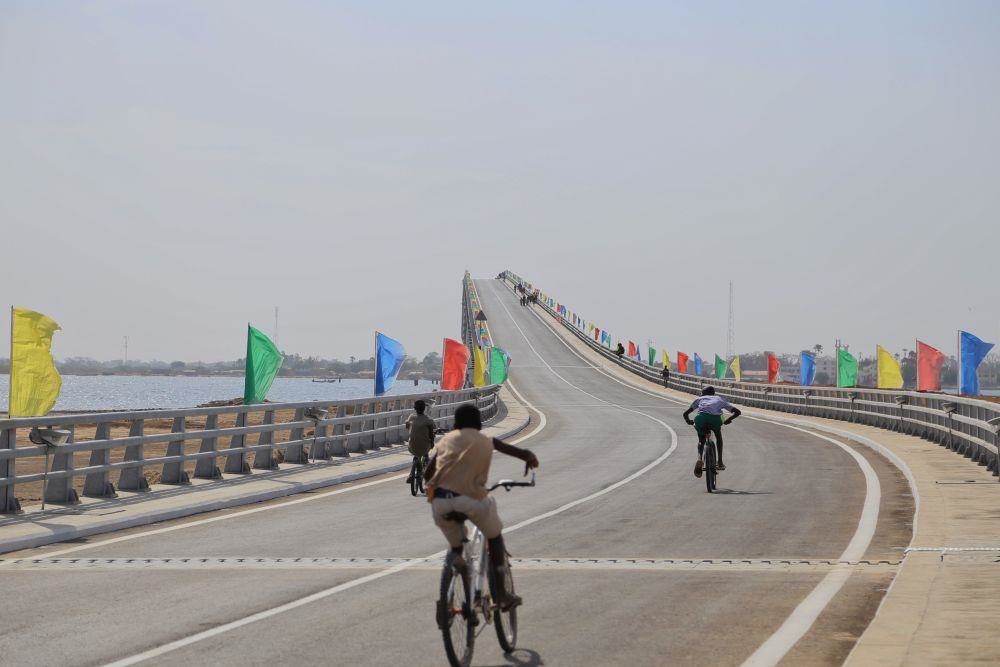 △2022年1月16日,人們騎車(chē)通過(guò)位于塞內(nèi)加爾方久尼市、由中國(guó)公司承建的方久尼大橋。