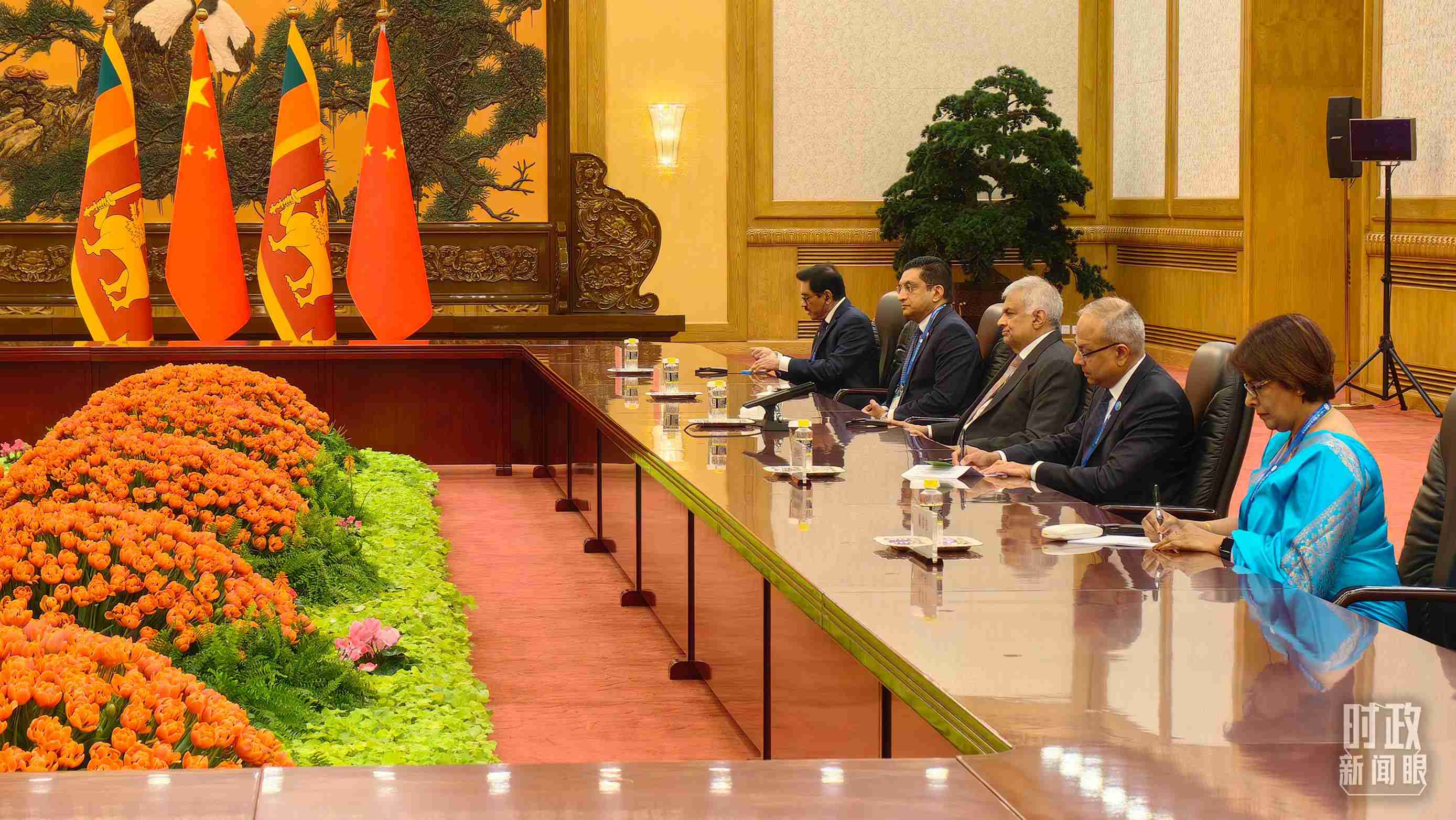 △會見現(xiàn)場擺放的中國、斯里蘭卡國旗。(總臺央視記者范一鳴拍攝)