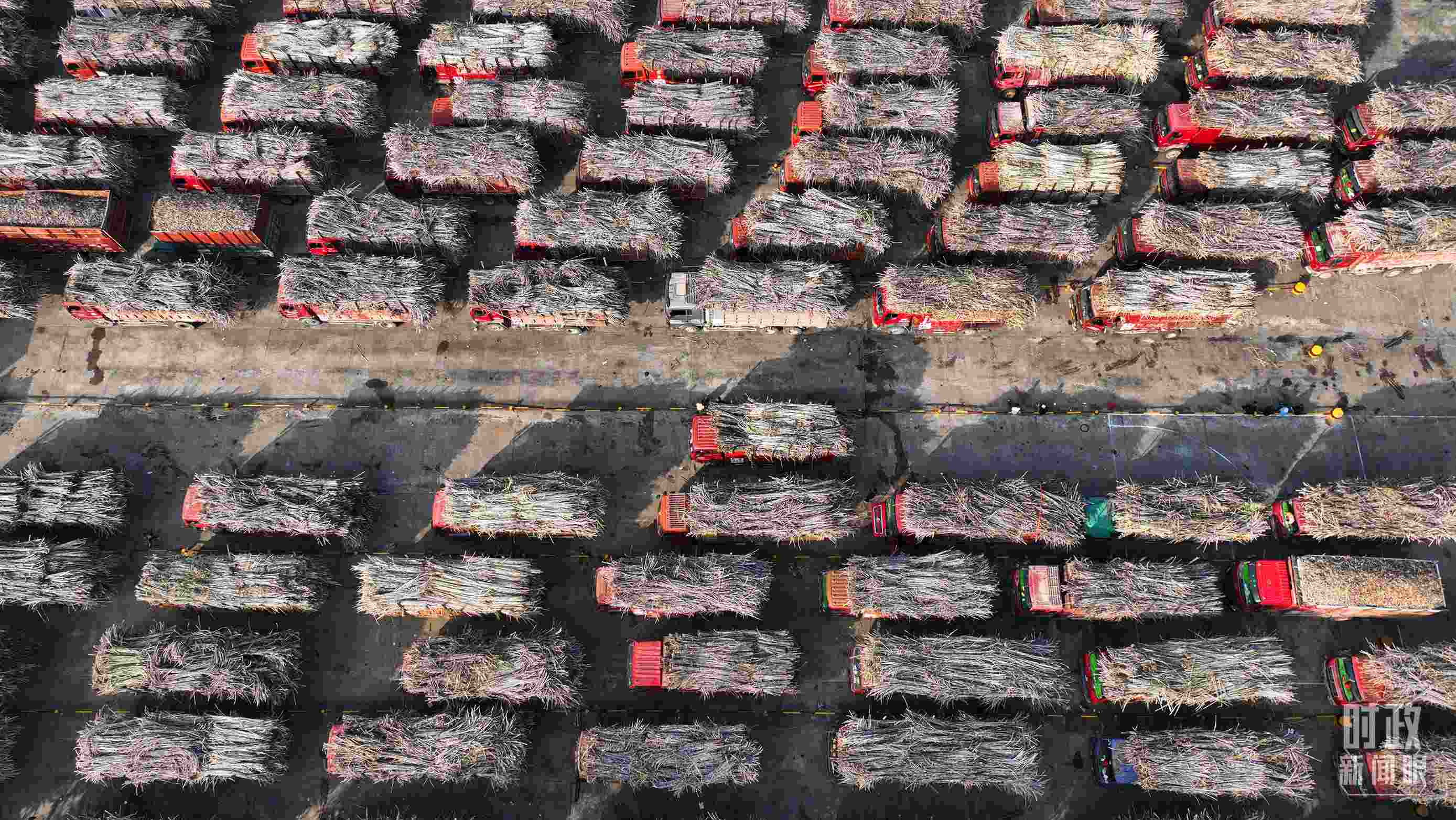 △來賓東糖鳳凰有限公司內(nèi)的甘蔗原料停放區(qū)。(總臺央視記者范凱拍攝)