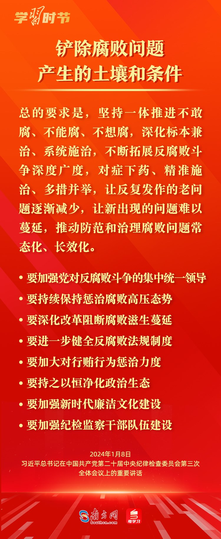 1月8日,中共中央總書記、國家主席、中央軍委主席習近平在中國共產(chǎn)黨第二十屆中央紀律檢查委員會第三次全體會議上發(fā)表重要講話,深刻闡述黨的自我革命的重要思想,對持續(xù)發(fā)力、縱深推進反腐敗斗爭作出戰(zhàn)略部署。