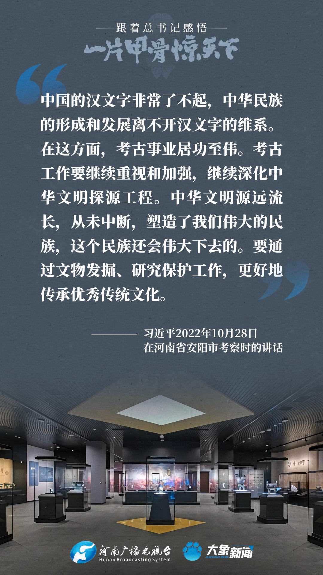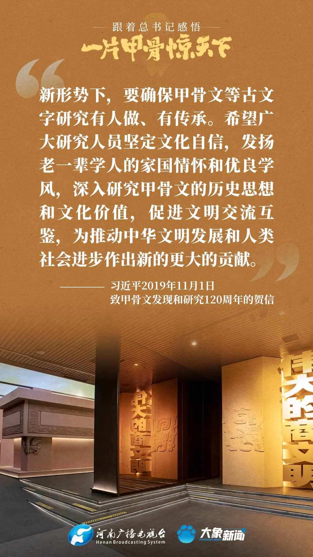 黨的十八大以來,習近平總書記多次就殷墟和甲骨文保護研究利用工作作出重要講話重要指示,為我們堅定文化自信,傳承發(fā)展中華優(yōu)秀傳統(tǒng)文化提供了根本遵循。大象新聞邀您一起回顧、學習。