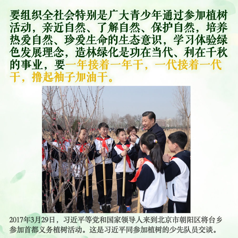 十年樹(shù)木,百年樹(shù)人。除去2020年因疫情防控考慮,每年植樹(shù)時(shí),習(xí)總書記都要和少年兒童一起,培土澆水、談心交流。好好學(xué)習(xí),鍛煉身體,熱愛(ài)勞動(dòng),愛(ài)護(hù)環(huán)境,德智體美勞全面發(fā)展,長(zhǎng)大后成為建設(shè)祖國(guó)的棟梁之才……習(xí)爺爺?shù)囊笠髧谕泻拖<剑?lì)著新時(shí)代少年兒童奮發(fā)有為、向陽(yáng)成長(zhǎng)。