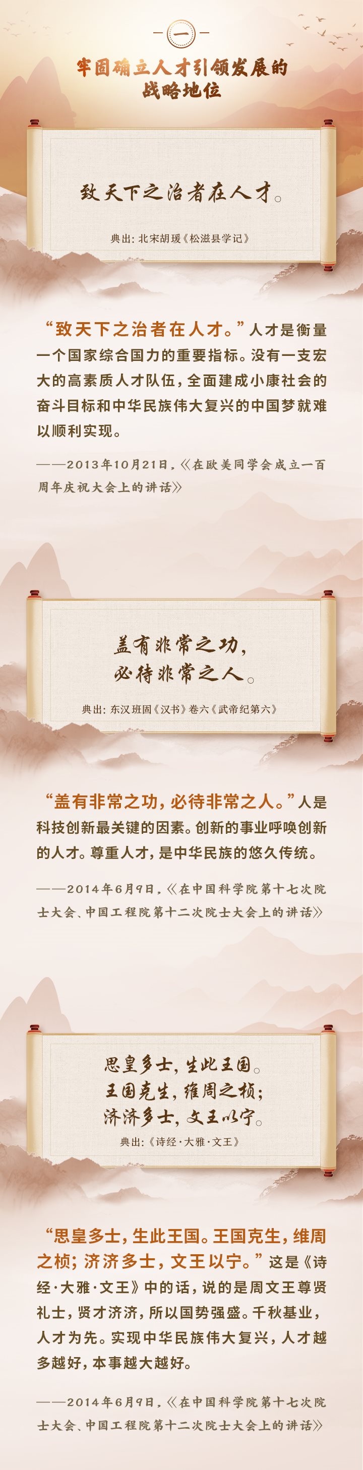 編者按:培養(yǎng)造就大批德才兼?zhèn)涞母咚刭|(zhì)人才,是國(guó)家和民族長(zhǎng)遠(yuǎn)發(fā)展大計(jì)。黨的十八大以來(lái),習(xí)近平總書記圍繞人才工作發(fā)表一系列重要論述,立意高遠(yuǎn),內(nèi)涵豐富,思想深刻,深刻回答了為什么建設(shè)人才強(qiáng)國(guó)、什么是人才強(qiáng)國(guó)、怎樣建設(shè)人才強(qiáng)國(guó)的重大理論和實(shí)踐問題。在這些重要論述中,總書記精妙運(yùn)用古代典籍、經(jīng)典名句,以古喻今、啟迪思想、激蕩精神,讓我們一起來(lái)學(xué)習(xí)!
