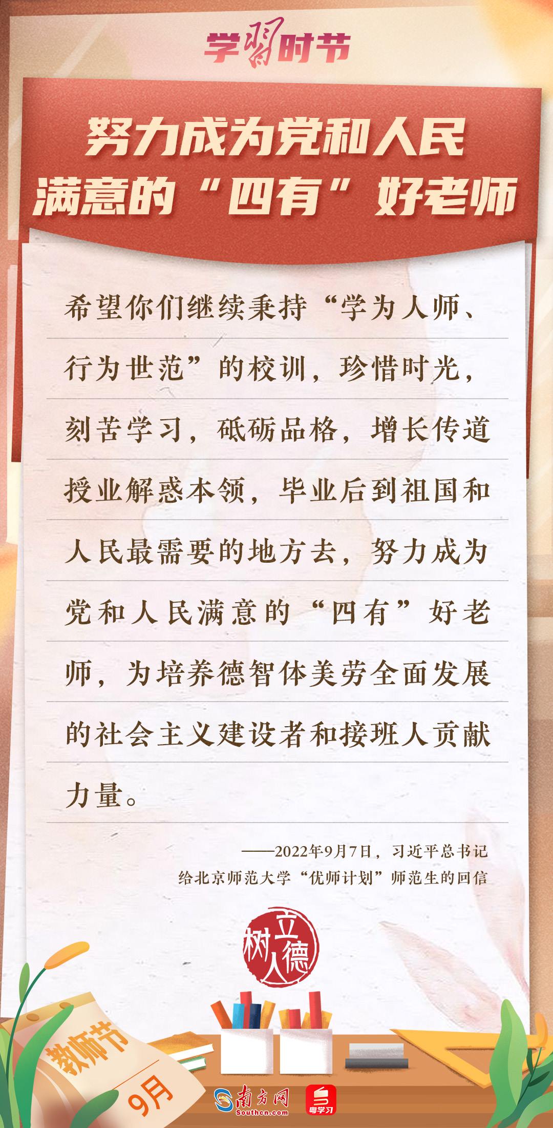 “百年大計,教育為本。教育大計,教師為本?!秉h的十八大以來,習(xí)近平總書記多次以書信形式向教師群體和教育工作者表達囑托與期望,諄諄話語,催人奮進。在第四十個教師節(jié)到來之際,讓我們一起重溫總書記的諄諄寄語!