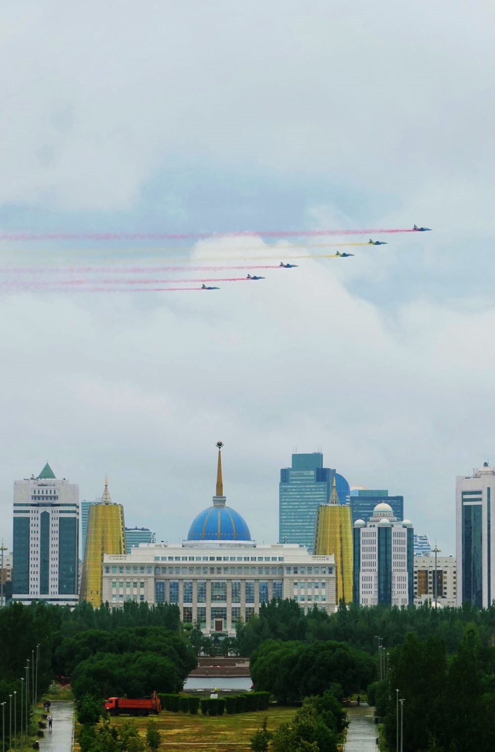習(xí)近平主席抵達(dá)時(shí),哈方多架戰(zhàn)機(jī)在總統(tǒng)府上空拉出中國國旗色彩煙歡迎中國貴賓。