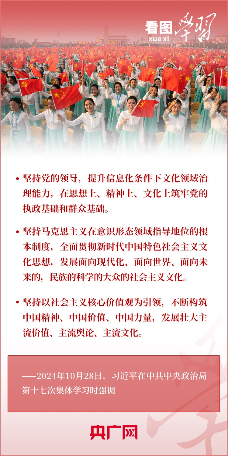 建設(shè)文化強(qiáng)國是全黨全社會(huì)的共同任務(wù)。10月28日,中共中央政治局就建設(shè)文化強(qiáng)國進(jìn)行第十七次集體學(xué)習(xí)。習(xí)近平總書記在聽取講解和討論后發(fā)表重要講話,就錨定2035年建成文化強(qiáng)國戰(zhàn)略目標(biāo)作出最新部署,強(qiáng)調(diào)要“不斷發(fā)展具有強(qiáng)大思想引領(lǐng)力、精神凝聚力、價(jià)值感召力、國際影響力的新時(shí)代中國特色社會(huì)主義文化,不斷增強(qiáng)人民精神力量,筑牢強(qiáng)國建設(shè)、民族復(fù)興的文化根基。”一起來學(xué)習(xí)!