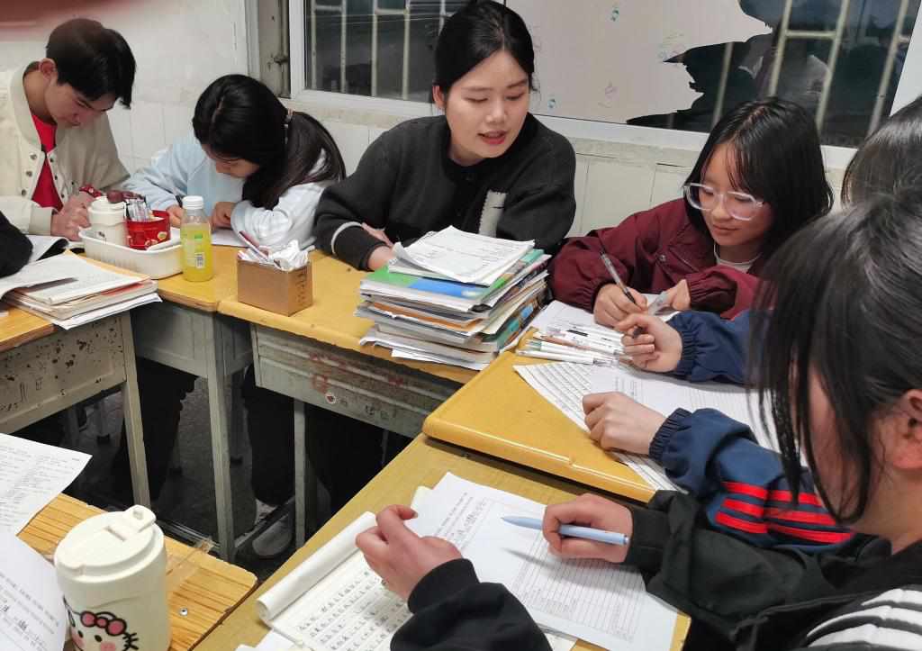 2024年4月21日,云南昭通大關(guān)一中教師劉雪瑤(左三)在輔導(dǎo)學(xué)生做作業(yè)。(李龍強(qiáng) 攝)