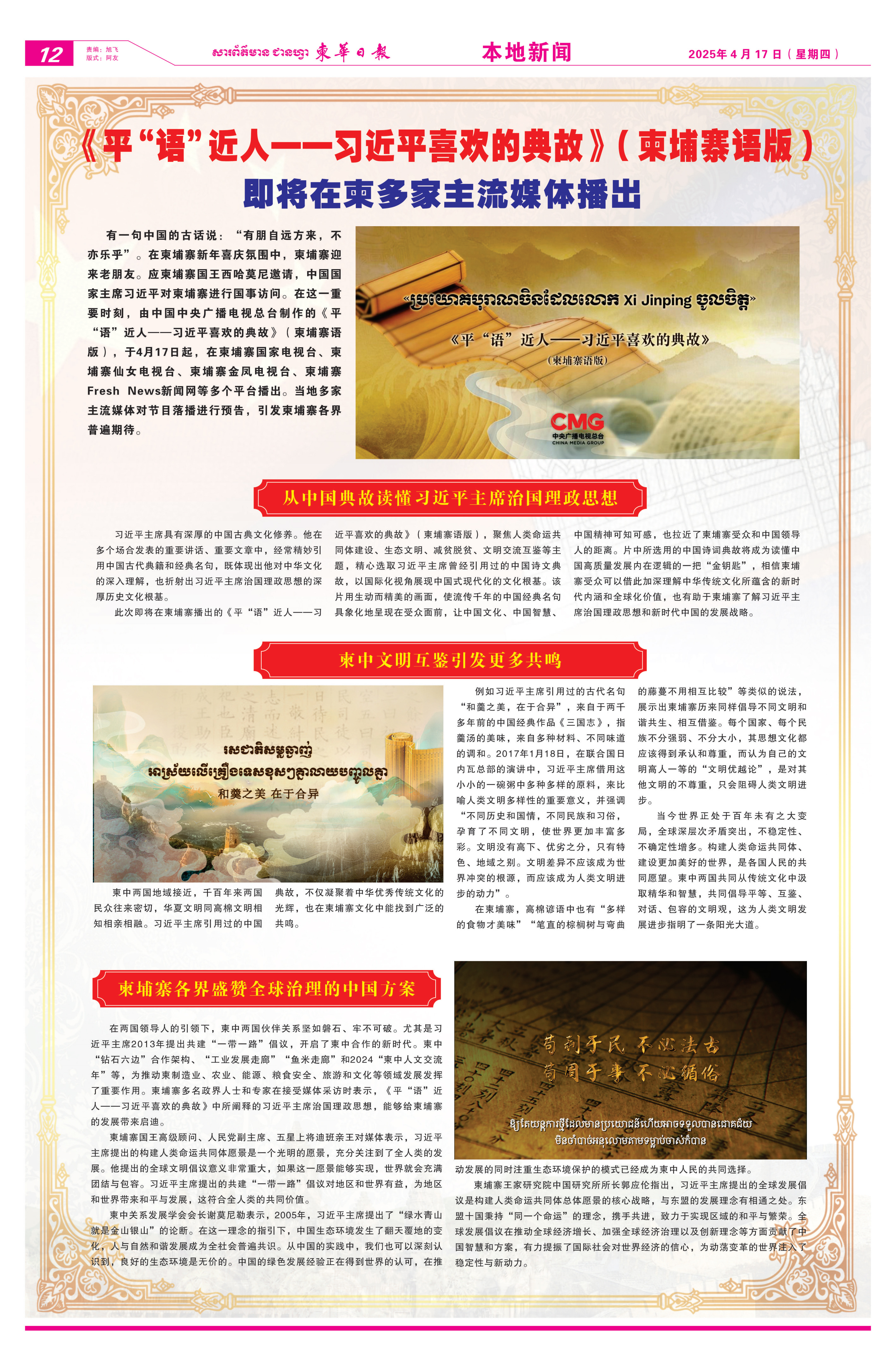 4月12日至17日,《柬華日報》《大都市報》等當(dāng)?shù)貓蠹埧l(fā)節(jié)目播出預(yù)告消息。文章指出,《平“語”近人——習(xí)近平喜歡的典故》(柬埔寨語版)是一把讀懂中國高質(zhì)量發(fā)展內(nèi)在邏輯的“金鑰匙”,相信柬埔寨受眾可以通過這些中國古籍和經(jīng)典名句加深理解中華優(yōu)秀傳統(tǒng)文化所蘊含的新時代內(nèi)涵和全球化價值,了解習(xí)近平主席治國理政思想和新時代中國的發(fā)展戰(zhàn)略。