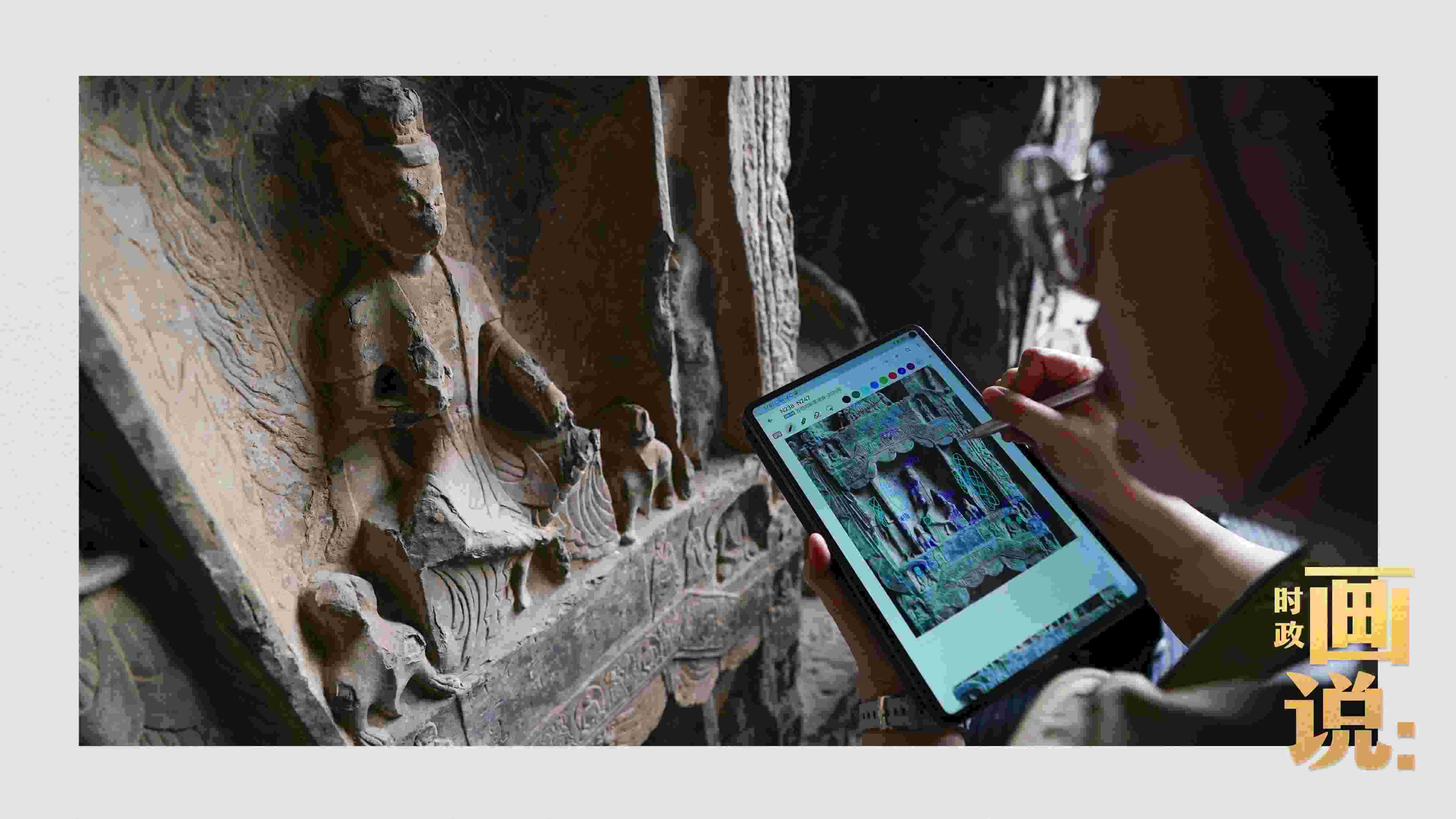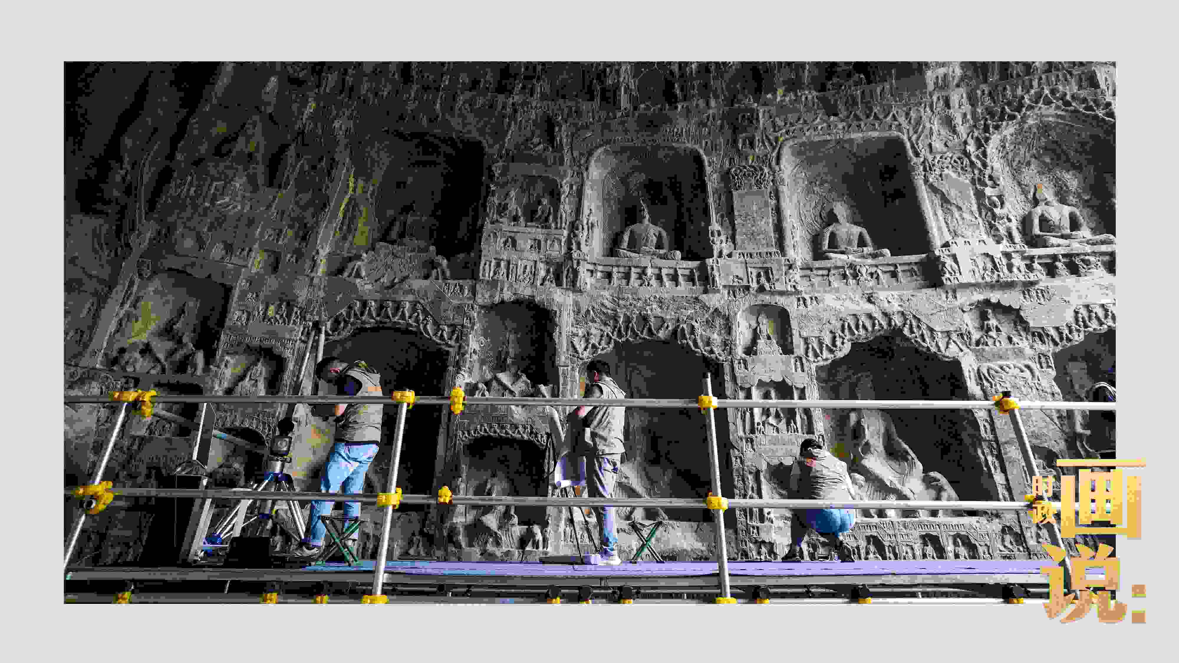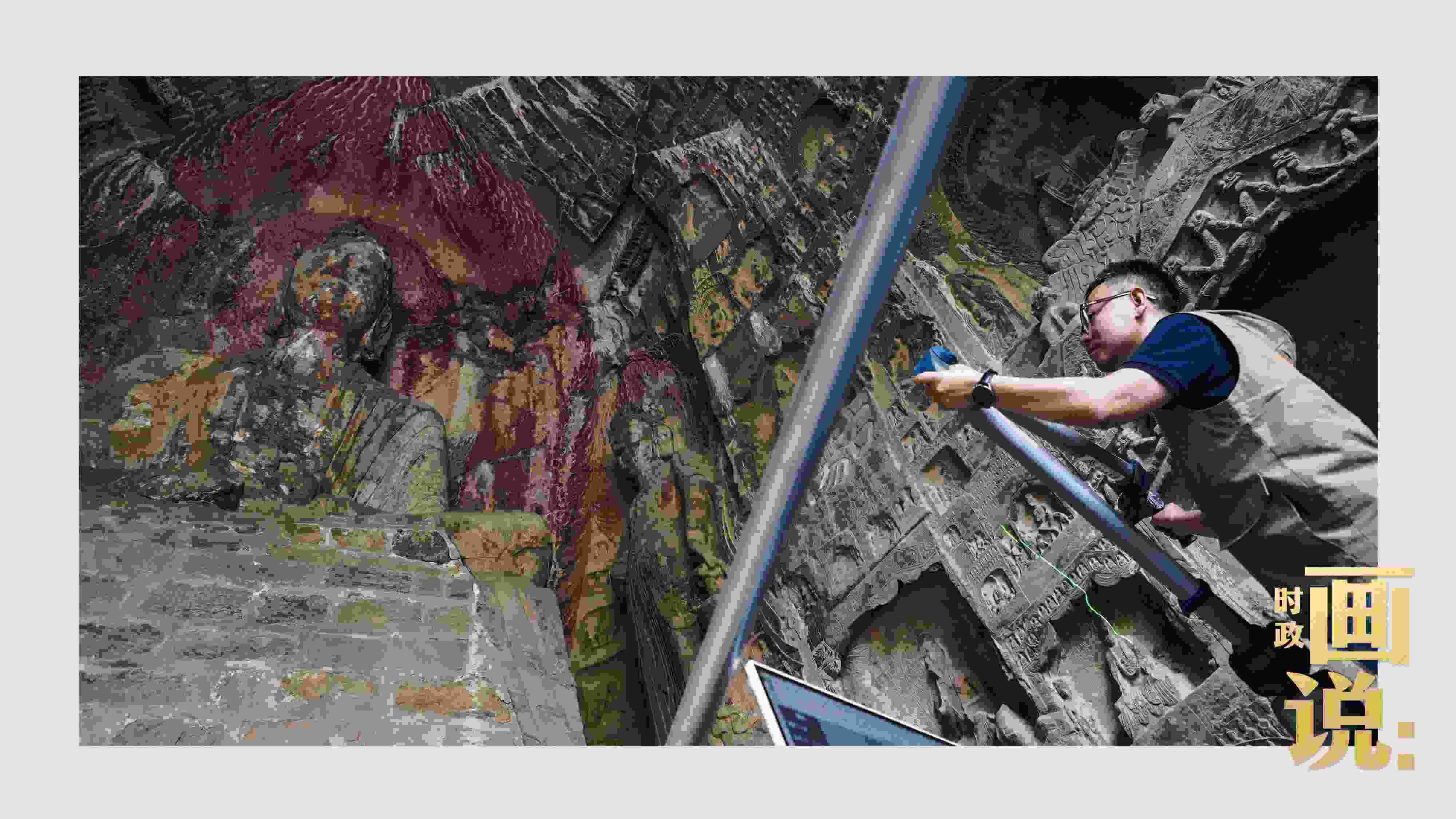 △龍門(mén)石窟研究院工作人員在古陽(yáng)洞使用關(guān)節(jié)臂掃描儀對(duì)佛像進(jìn)行數(shù)字化掃描