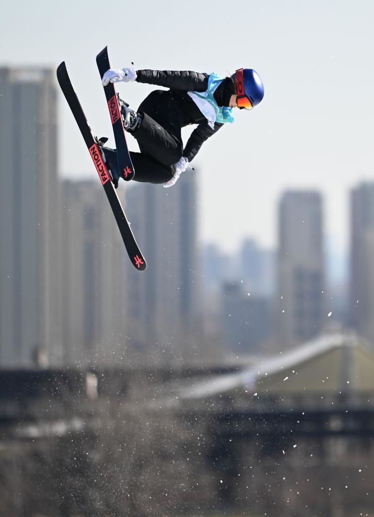 2月8日,中國(guó)選手谷愛(ài)凌在北京2022年冬奧會(huì)自由式滑雪女子大跳臺(tái)決賽中。新華社記者李尕?cái)z