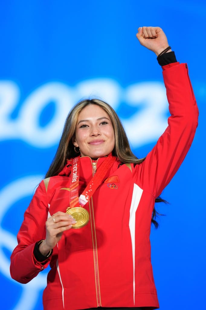 2月8日,冠軍中國(guó)選手谷愛(ài)凌在北京2022年冬奧會(huì)自由式滑雪女子大跳臺(tái)獎(jiǎng)牌頒發(fā)儀式上。新華社記者鞠煥宗攝