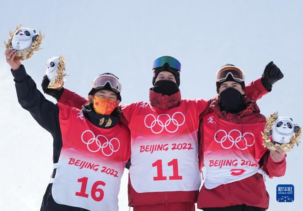 2月7日,獲得冠軍的加拿大選手馬克斯·帕羅特(中),獲得亞軍的中國選手蘇翊鳴(左)和獲得季軍的加拿大選手馬克·麥克莫里斯在頒發(fā)紀念品儀式上。新華社記者楊世堯攝