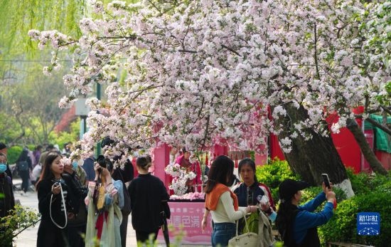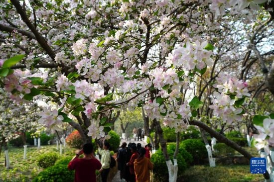 3月21日,在濟(jì)南市五龍?zhí)豆珗@,人們在觀賞盛開的海棠花。