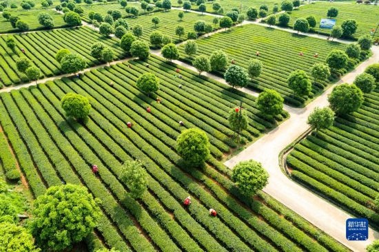 4月11日,在長沙望城烏山貢茶基地,茶農(nóng)采摘春茶(無人機照片)。