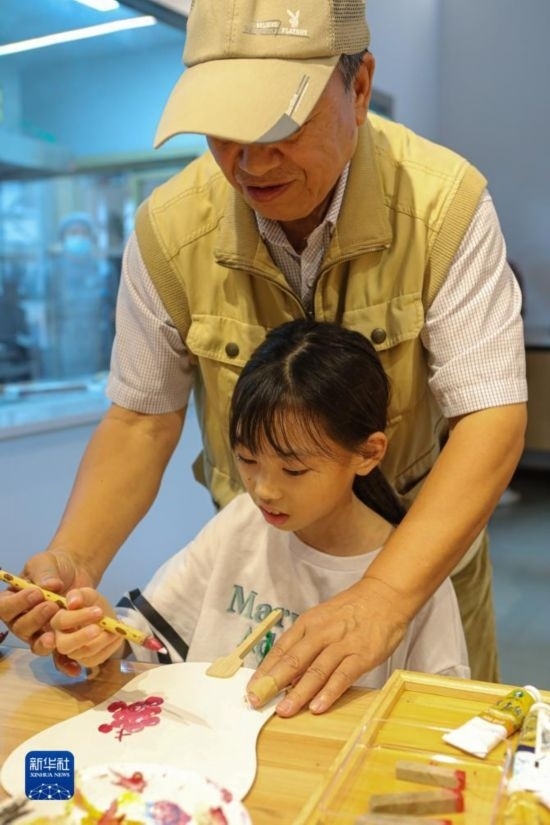 9月24日,在婁塘塌餅非遺傳承館,外國小朋友體驗(yàn)畫扇面。