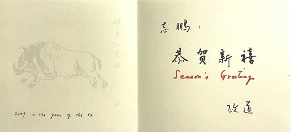 2009年為農(nóng)歷已丑年,俗稱(chēng)牛年。李政道在賀年卡上畫(huà)了一頭健壯的牛。這頭牛騰起四蹄,犄角對(duì)著前方,勇猛無(wú)比。淡淡的筆墨,精準(zhǔn)的線(xiàn)條,黑白的布局,一頭開(kāi)山牛躍然紙上。牛尾的右上部,他用鉛筆輕輕寫(xiě)上了:“仿唐人筆法”。然后簽上了自己名字中的“政”字。