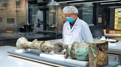 文物修復(fù)四川省文物考古研究院三星堆遺址工作站站長雷雨在查看拼對成功的鳥足曲身頂尊神像。新華社記者 肖 林?jǐn)z