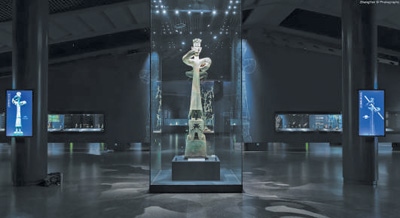 陳列展覽三星堆博物館展出的青銅大立人,旁邊采用多媒體技術(shù)展示其服飾與造型解讀。宋豪新 張 艷攝影報(bào)道
