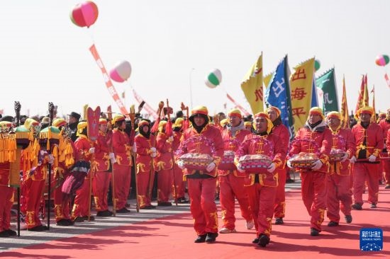當(dāng)日,遼寧省盤(pán)錦市舉辦盤(pán)錦首屆漁雁文化節(jié)暨第六屆二界溝開(kāi)海節(jié)。活動(dòng)中漁家祭祀、非遺秧歌、舞獅等演出再現(xiàn)當(dāng)?shù)貪O雁文化,漁民也通過(guò)這樣的形式表達(dá)盼望新一年漁業(yè)豐收的美好愿望。