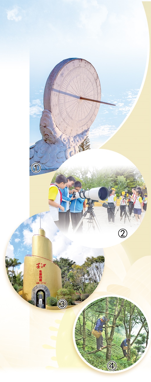 游客行走在標(biāo)志園內(nèi),可以沿著腳下被玻璃罩住的“北回歸線”標(biāo)志開始游覽。一路自東向西,游客能看到兩邊種植著不同的植物,古代“計(jì)時(shí)器”日晷上隨時(shí)間而移動(dòng)的影子,墨江天文館中炫酷的“大塊頭”望遠(yuǎn)鏡……“標(biāo)志園在設(shè)計(jì)時(shí)就將豐富的天文、地理知識(shí)融入其中,近年來又加入裸眼3D科普電影等內(nèi)容,很多科普研學(xué)活動(dòng)在此舉辦?!蹦h文化和旅游局局長(zhǎng)楊春德說。