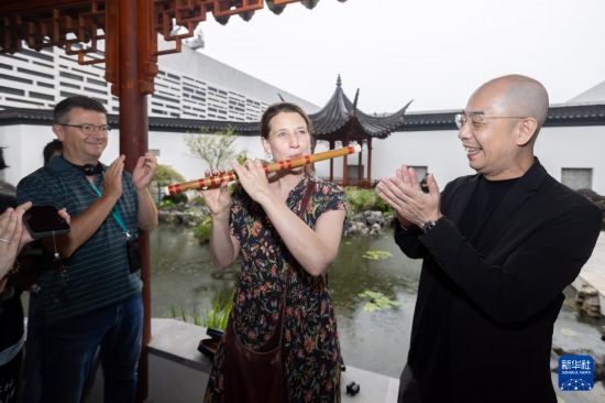 6月25日,柏林愛樂樂團(tuán)的樂手在嘗試吹奏中國竹笛。