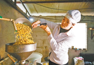 貴州省貴陽(yáng)市修文縣久長(zhǎng)鎮(zhèn)孟沖村一家豆腐加工作坊,工作人員將大豆舀入打漿機(jī)加工。周訓(xùn)超攝(人民視覺(jué))
