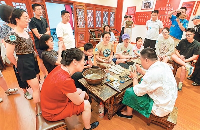 在東城區(qū)傳統(tǒng)韻味體驗(yàn)之旅中,游客在吉祥大戲院國(guó)粹京劇體驗(yàn)基地可以穿戴上京劇服裝道具,體驗(yàn)戲曲演員化妝過(guò)程,品嘗戲曲主題“吉祥咖啡”,觀看經(jīng)典京劇演出,與名師名家互動(dòng),零距離感受?chē)?guó)粹經(jīng)典的魅力;在廣譽(yù)遠(yuǎn)中醫(yī)藥文化體驗(yàn)基地,游客通過(guò)聽(tīng)中醫(yī)講解、辨藥材識(shí)優(yōu)劣、手工制作香囊等多種體驗(yàn)方式,感受中醫(yī)藥文化。在和平菓局京味文化體驗(yàn)基地,游客可以走進(jìn)煤廠(chǎng)胡同、小覺(jué)寺等老北京場(chǎng)景,體驗(yàn)拉洋片、草編藝術(shù)、皮影、捏面人等傳統(tǒng)京味文化。