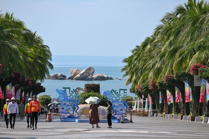 2024年11月19日,游客從位于三亞天涯海角游覽區(qū)的運(yùn)動(dòng)會(huì)吉祥物前經(jīng)過(guò)。新華社記者 陳澤國(guó) 攝
