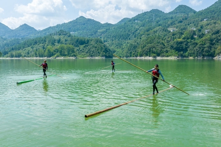 2023年9月15日,愛(ài)好者在湖北宣恩雙龍湖上練習(xí)“獨(dú)竹漂”(無(wú)人機(jī)照片)。新華社發(fā)(王法鈞攝)