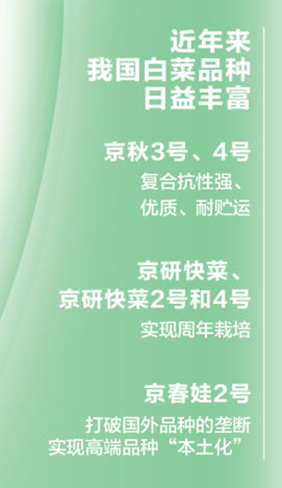 近年來,我國白菜育種實力突飛猛進,品種日益豐富,實現(xiàn)了從單一“秋播冬貯”向優(yōu)勢產(chǎn)區(qū)生產(chǎn)、產(chǎn)品多樣化和周年生產(chǎn)轉(zhuǎn)變。培育出了復合抗性強、優(yōu)質(zhì)、耐貯運的品種“京秋3號、4號”等,高品質(zhì)、速生苗用品種“京研快菜、京研快菜2號和4號”3個品種搭配實現(xiàn)了周年栽培,解決了生產(chǎn)上長期缺乏冬春和夏季栽培專用品種的難題。還育成了娃娃菜、快菜、紹菜、金絲白等高品質(zhì)品種,尤其是“京春娃2號”一舉打破國外品種的壟斷,它比國外品種早熟5至7天,種植密度高25%,畝收入增長30%,已成為國產(chǎn)娃娃菜第一大品種,實現(xiàn)了高端品種的“本土化”。