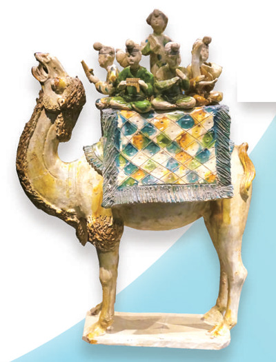 陜西歷史博物館藏三彩載樂駱駝俑,見證了文化藝術(shù)交融的歷史。一塊色彩斑斕的毛毯置于駝背之上,7名樂手手持不同樂器盤腿演奏,中間一女子正動(dòng)情歌唱。一個(gè)“駝背上的樂隊(duì)”,再現(xiàn)了鮮活的盛唐長(zhǎng)安,各地人們?cè)诖讼嘤?,盡情演繹對(duì)美好生活的追求。