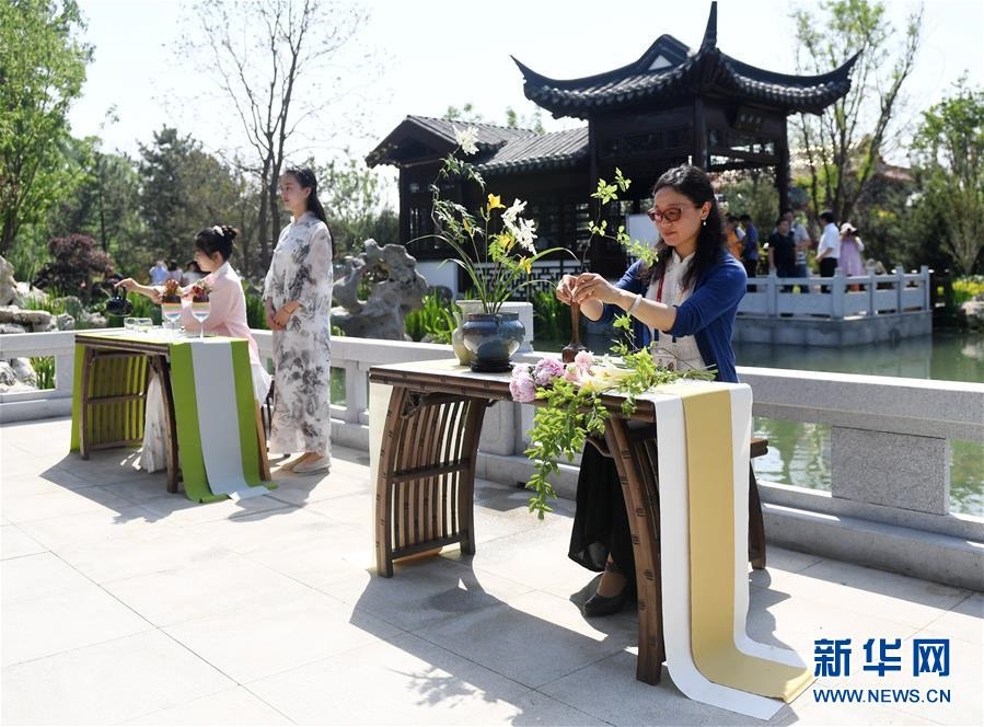 工作人員在北京世園會(huì)江蘇園內(nèi)展示插花技藝(6月2日攝)。