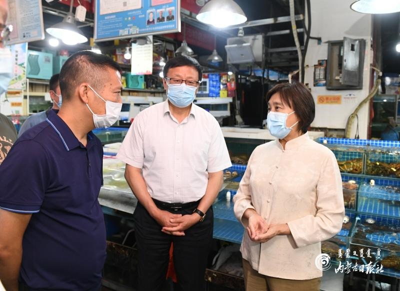 6月22日,自治區(qū)黨委副書記、自治區(qū)主席、自治區(qū)新冠肺炎疫情防控工作指揮部總指揮布小林,自治區(qū)副主席、自治區(qū)防控工作指揮部副總指揮歐陽曉暉來到位于呼和浩特市賽罕區(qū)的融橋海鮮市場,了解海鮮和水產(chǎn)品產(chǎn)地、物流運(yùn)輸、銷量變化等情況。內(nèi)蒙古日?qǐng)?bào)社融媒體記者 韓卿立 攝