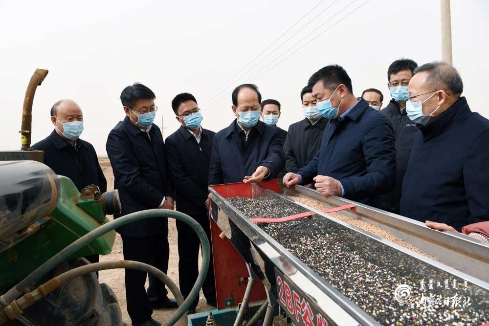 驚蟄已過,春耕在即。石泰峰一下飛機(jī)就驅(qū)車來到臨河農(nóng)場(chǎng)八分場(chǎng),直奔田間地頭,考察春耕備耕情況。在小麥播種現(xiàn)場(chǎng),他與種植戶和當(dāng)?shù)馗刹抗苍掁r(nóng)桑,詳細(xì)了解土壤墑情、測(cè)土施肥、種植結(jié)構(gòu)、糧播面積、春耕資金保障等情況,并與大家一筆筆測(cè)算成本、估算收入。石泰峰說,當(dāng)前正值農(nóng)業(yè)生產(chǎn)的關(guān)鍵時(shí)期,各地要不違農(nóng)時(shí)地謀劃好組織好各項(xiàng)工作,加強(qiáng)農(nóng)機(jī)、農(nóng)資、種子供應(yīng)儲(chǔ)備,研究搞好市場(chǎng)供需調(diào)度和產(chǎn)銷對(duì)接,為今年糧食豐收和農(nóng)民增收打好基礎(chǔ)。他指出,耕地是最寶貴的資源,我們既要用好耕地,也要采取有效措施護(hù)地養(yǎng)地,推動(dòng)農(nóng)業(yè)可持續(xù)發(fā)展?! ?/p>