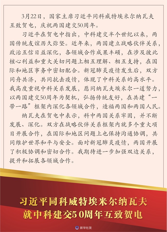 習(xí)近平在賀電中指出,中科建交半個(gè)世紀(jì)以來,兩國傳統(tǒng)友誼歷久彌堅(jiān)。近年來,兩國建立戰(zhàn)略伙伴關(guān)系,政治互信日益深化,各領(lǐng)域合作成果豐碩,在涉及彼此核心利益和重大關(guān)切問題上相互理解、相互支持,在國際和地區(qū)事務(wù)中密切配合。新冠肺炎疫情發(fā)生后,雙方同舟共濟(jì),共同抗擊疫情,體現(xiàn)了中科關(guān)系的高水平。我高度重視中科關(guān)系發(fā)展,愿同納瓦夫埃米爾一道努力,以兩國建交50周年為契機(jī),弘揚(yáng)傳統(tǒng)友好,在共建“一帶一路”框架內(nèi)深化各領(lǐng)域合作,造福兩國和兩國人民。