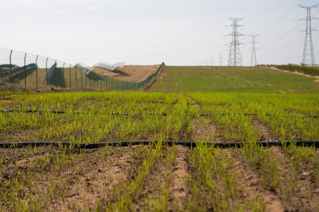 秋天的庫布其,午后的陽光照在金色沙丘上。在鄂爾多斯市達(dá)拉特旗光伏發(fā)電應(yīng)用領(lǐng)跑基地的一片光伏板旁,馬天景和往常一樣,查看著試驗田里的牧草幼苗。