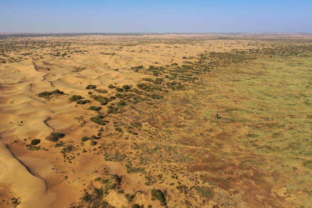 牧民寶音德力格爾家附近的庫布其沙漠(無人機(jī)照片)。新華社記者 李志鵬攝