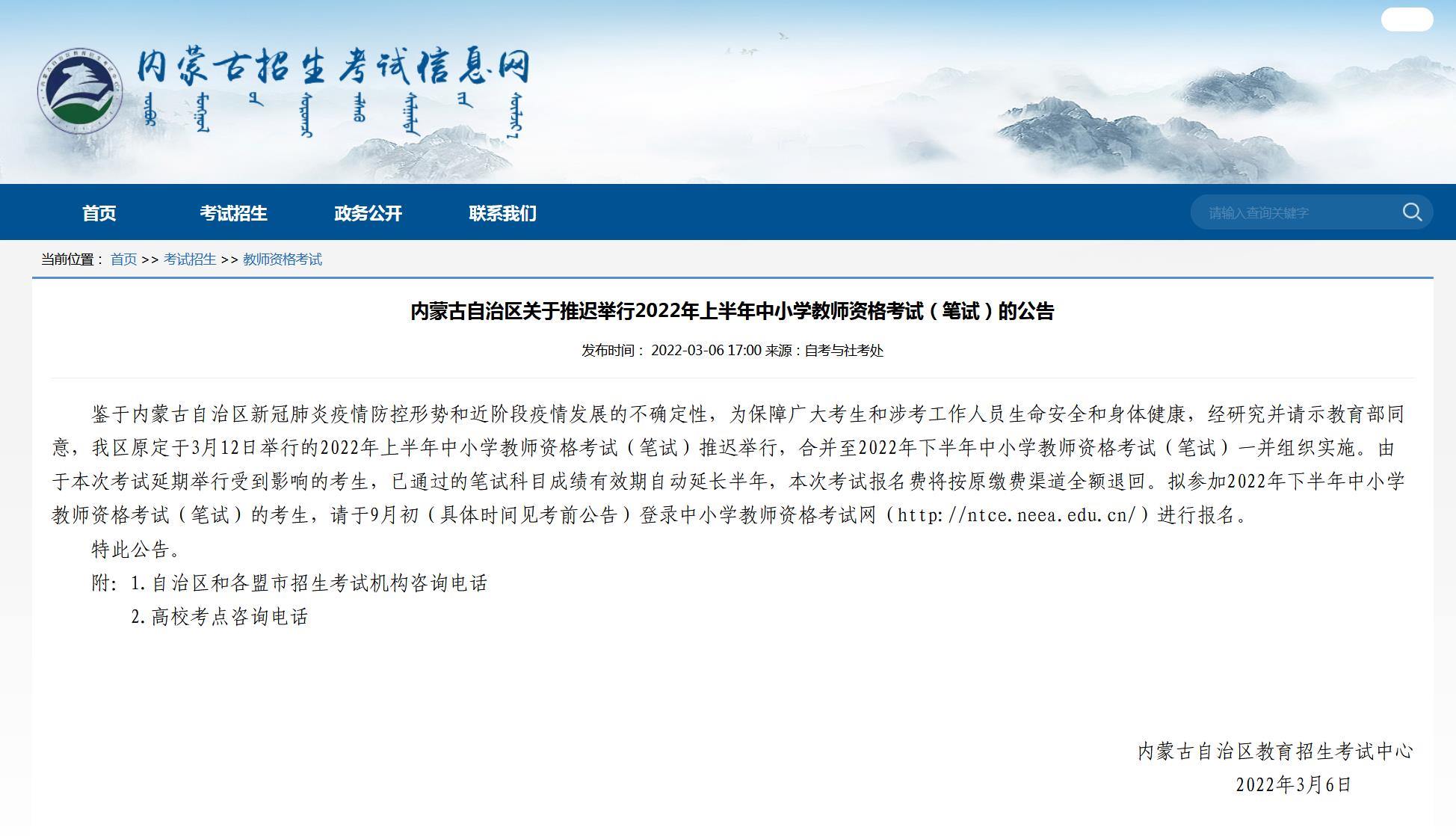 據(jù)內(nèi)蒙古招生考試信息網(wǎng)消息,3月6日,內(nèi)蒙古自治區(qū)教育招生考試中心發(fā)布公告稱,鑒于內(nèi)蒙古自治區(qū)新冠肺炎疫情防控形勢和近階段疫情發(fā)展的不確定性,為保障廣大考生和涉考工作人員生命安全和身體健康,經(jīng)研究并請示教育部同意,原定于3月12日舉行的2022年上半年中小學教師資格考試(筆試)推遲舉行,合并至2022年下半年中小學教師資格考試(筆試)一并組織實施。由于本次考試延期舉行受到影響的考生,已通過的筆試科目成績有效期自動延長半年,本次考試報名費將按原繳費渠道全額退回。