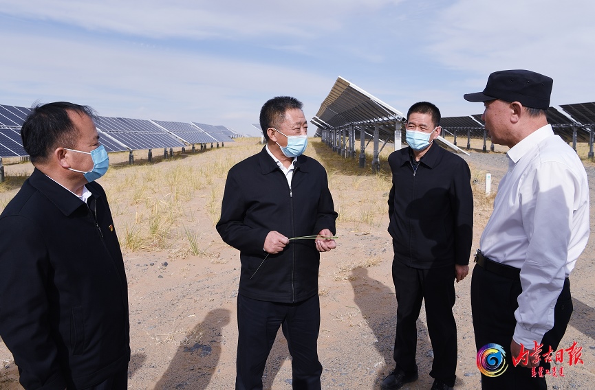 5月17日,自治區(qū)黨委書記孫紹騁考察阿拉善左旗內蒙古巴音新能源有限公司新能源基地建設及光伏治沙情況。記者袁永紅攝