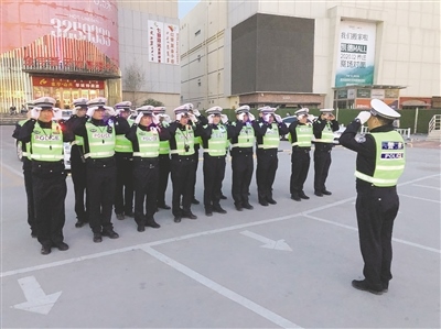 呼和浩特市公安局交管支隊(duì)玉泉區(qū)大隊(duì)一中隊(duì)交警上勤前整理著裝。