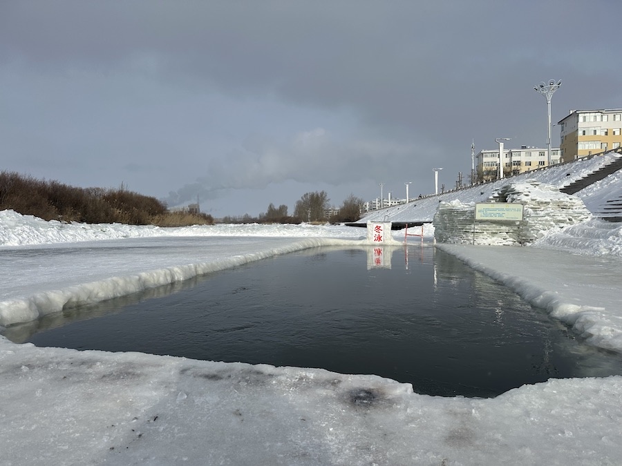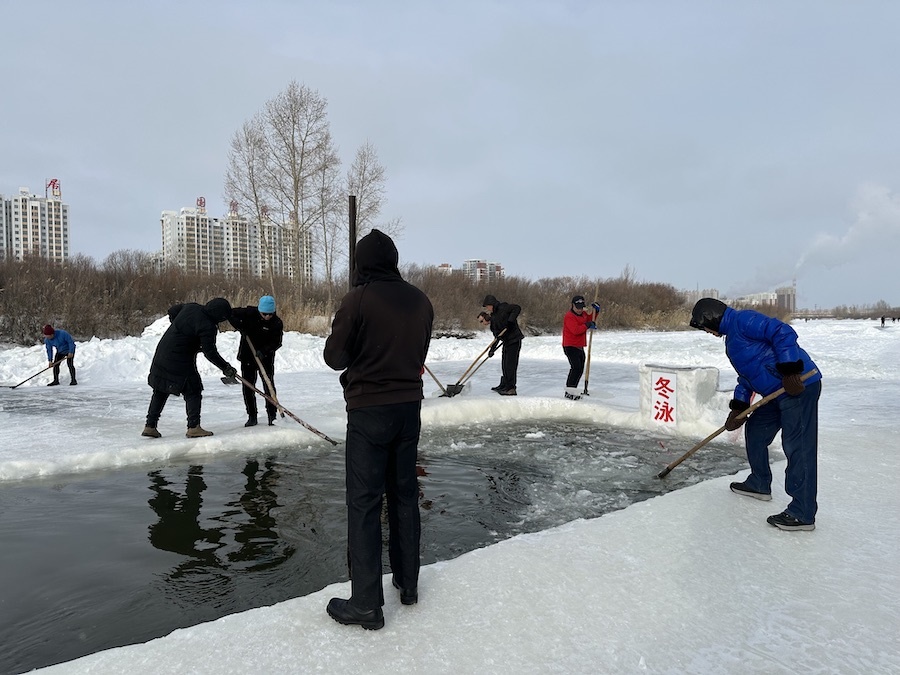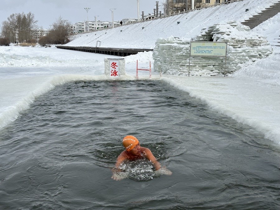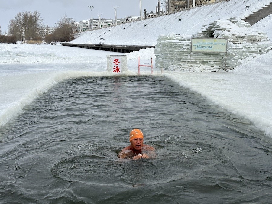 參加冬泳的協(xié)會(huì)成員只著泳衣,依次跳入在伊敏河冰面開(kāi)鑿的冬泳池中,雖然天寒地凍,但是依然精神抖擻。