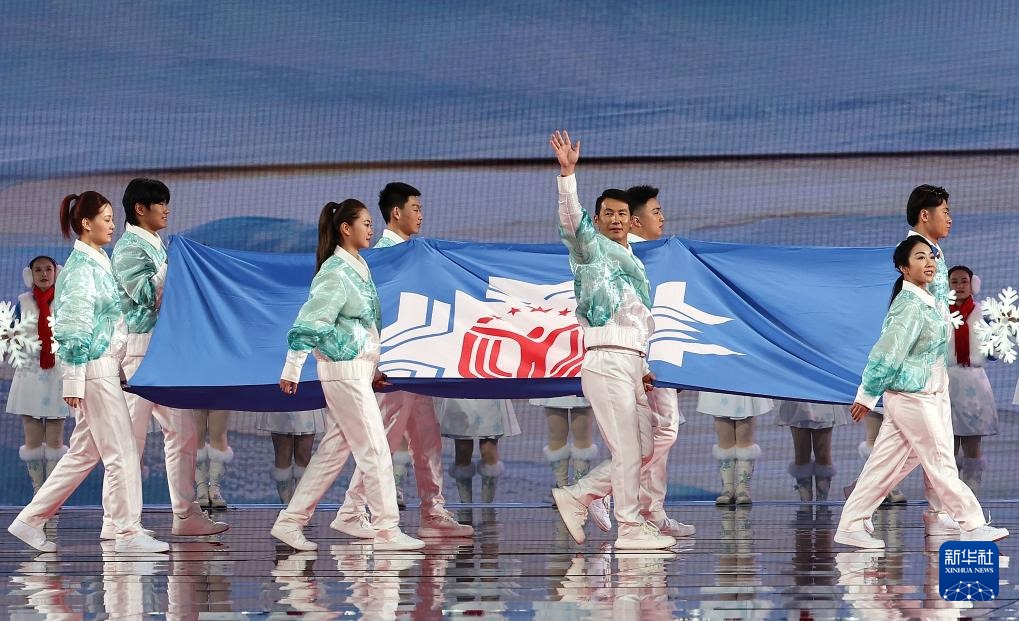 ??2月17日,中華人民共和國冬季運(yùn)動(dòng)會(huì)會(huì)旗在開幕式上入場。新華社記者 黃偉 攝