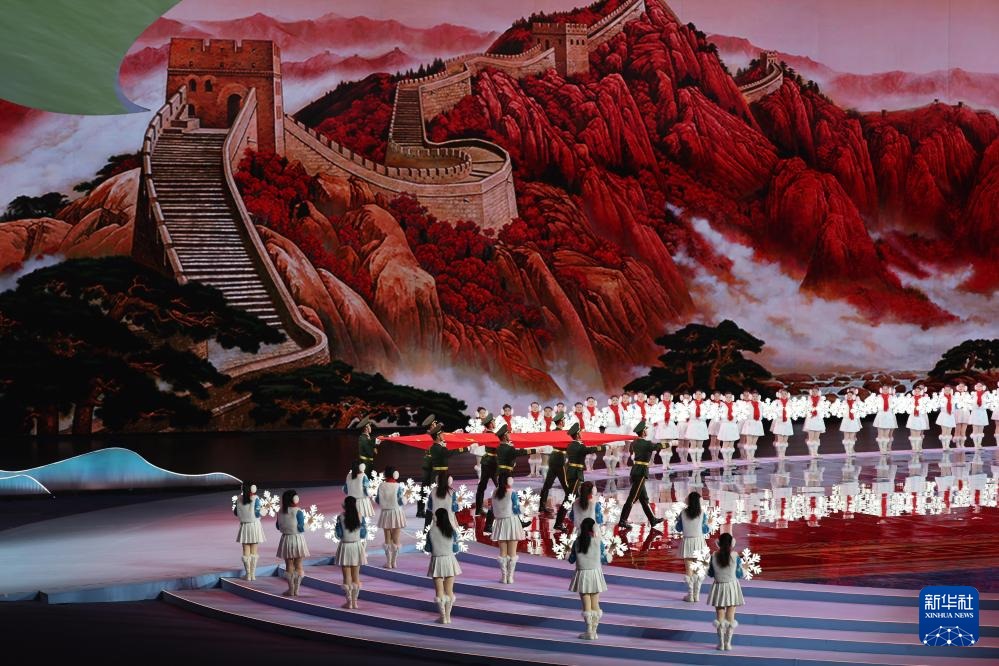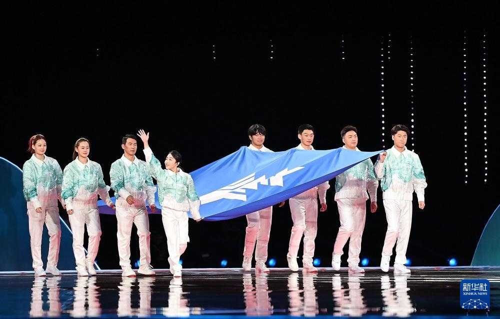??2月17日,中華人民共和國第十四屆冬季運(yùn)動(dòng)會(huì)會(huì)旗在開幕式上入場。新華社記者 楊晨光 攝