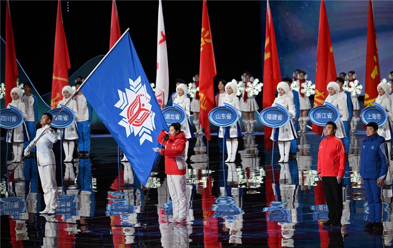 中華人民共和國第十四屆冬季運(yùn)動會會旗入場。
