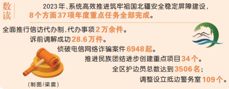 ——制定自治區(qū)本級專項應急預案47項,深入開展重大事故隱患專項排查整治2023行動,排查整改問題隱患48.76萬項。全面推行信訪代辦制,代辦事項2萬余件,初次信訪事項一次性化解率達到97%。深化訴源治理,建立“一站式”矛盾調解中心1094個,訴前調解成功28.6萬件。常態(tài)化開展掃黑除惡斗爭,嚴厲打擊各類違法犯罪活動,偵破電信網絡詐騙案件6948起,命案現案全破并破獲積案82起。