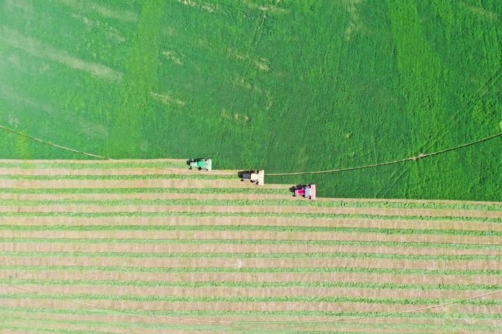 2023年6月4日,在土默特左旗國(guó)家現(xiàn)代農(nóng)業(yè)示范區(qū)內(nèi),機(jī)械車輛在收割苜蓿(無人機(jī)照片)。新華社記者劉磊攝