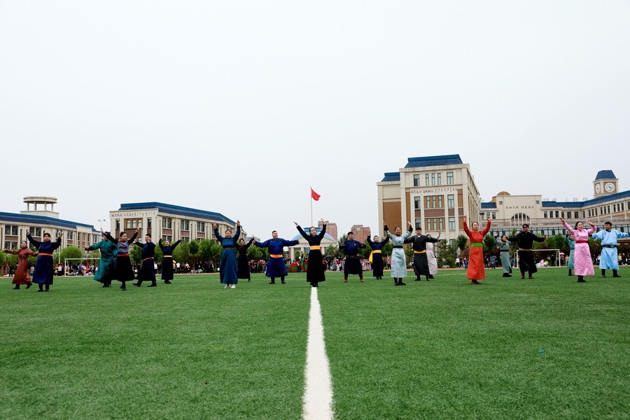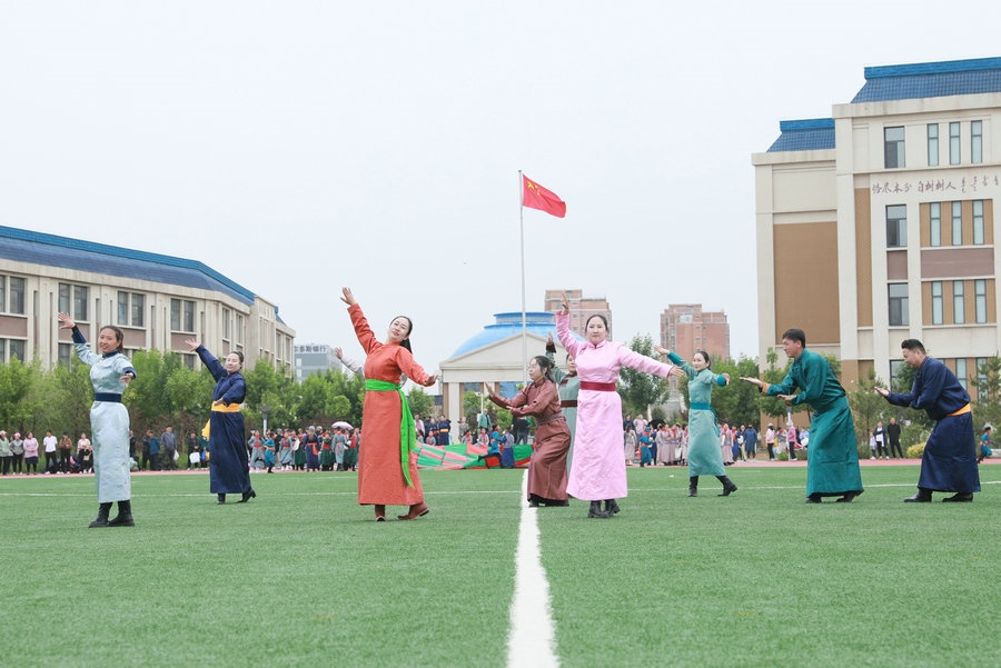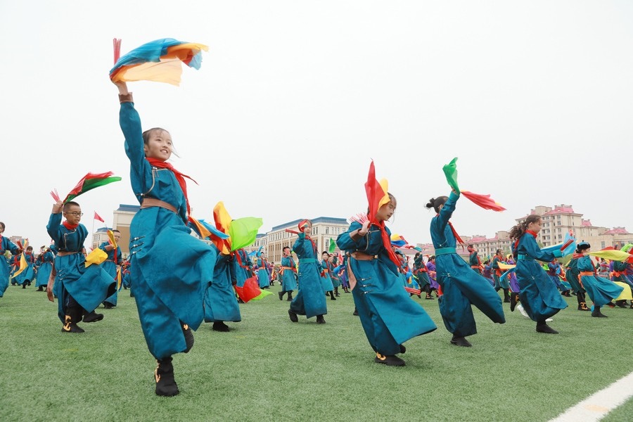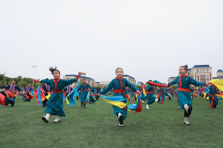 北疆新聞鄂爾多斯5月29日電(記者 張楊)“我們以鑄牢中華民族共同體意識為主線,創(chuàng)建了4個‘千人文化’特色課程,分別為千人足球、千人《江格爾》、千人筷子舞、千人棋類。”5月29日,內(nèi)蒙古鄂爾多斯鄂托克前旗“美育潤心·筑夢同行”第十四屆中小學(xué)師生藝術(shù)節(jié)暨慶“六一”國際兒童節(jié)多彩大課間操展示活動,在鄂托克前旗第一小學(xué)舉行。該校校長阿拉騰達來接受記者采訪時表示,創(chuàng)建這個特色課程的主要目的,是培養(yǎng)孩子多方面的才藝,為祖國培養(yǎng)有用之才。