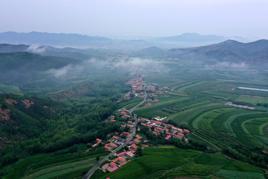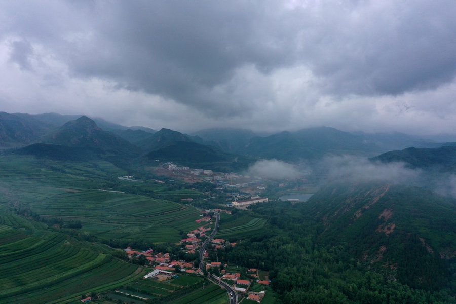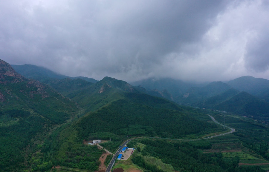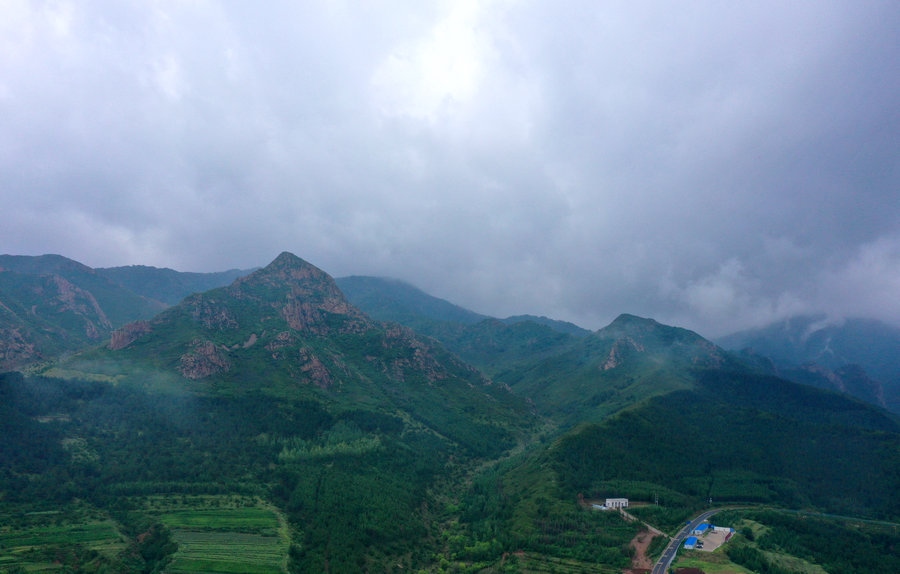 空中俯瞰細(xì)雨中的馬鞍山林場(chǎng)