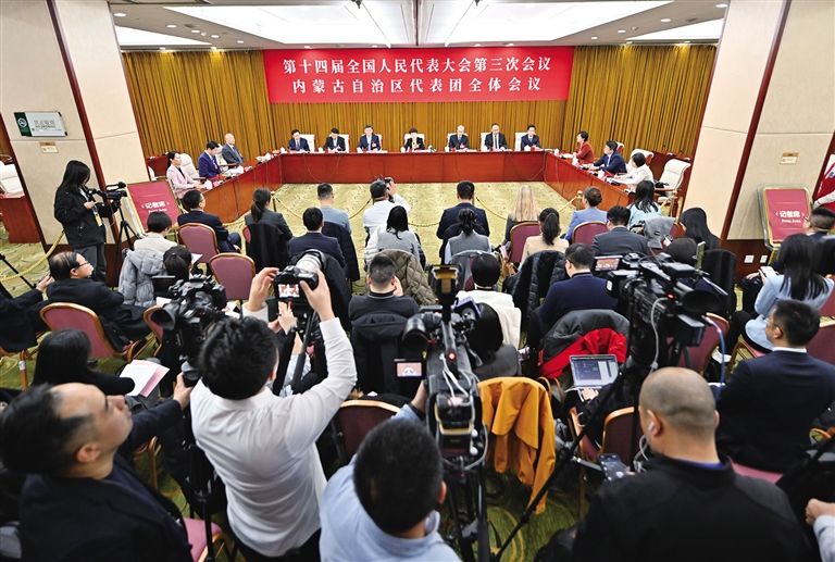 3月6日下午,十四屆全國人大三次會議內(nèi)蒙古代表團(tuán)在駐地舉行全團(tuán)會議,本次全團(tuán)會議向參加全國兩會報(bào)道的中外媒體開放。蓬勃發(fā)展的亮麗內(nèi)蒙古吸引了29家中外媒體的57名記者到場采訪,感受內(nèi)蒙古發(fā)展的蓬勃力量,講述全區(qū)上下深入落實(shí)習(xí)近平總書記的重要指示精神,貫穿一條主線,辦好兩件大事,弘揚(yáng)蒙古馬精神,闖新路進(jìn)中游的改革故事。
